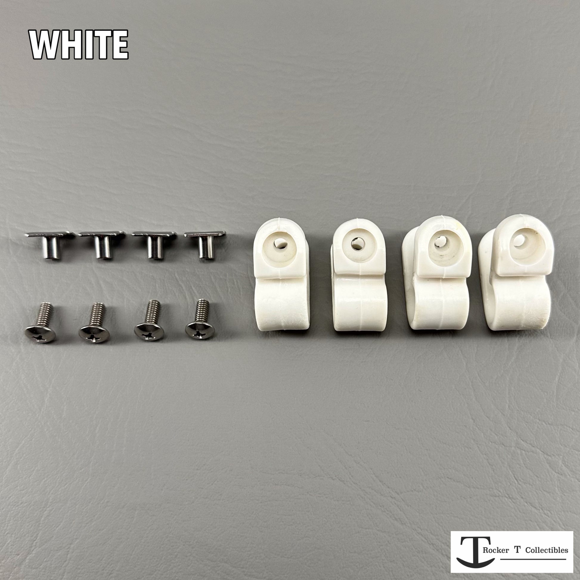 Restoring a helmet from the ’60s, ’70s, or ’80s with cracked or brittle facemask clips? Or building a throwback helmet that demands every detail be spot on? Now you can add authentic vintage white facemask clips, complete with your choice of screw colors. Rocker T delivers every crucial detail for the most exacting collectors. Limited quantities available—grab your set before they’re gone! Note: These clips are for display only and not intended for on-field use.