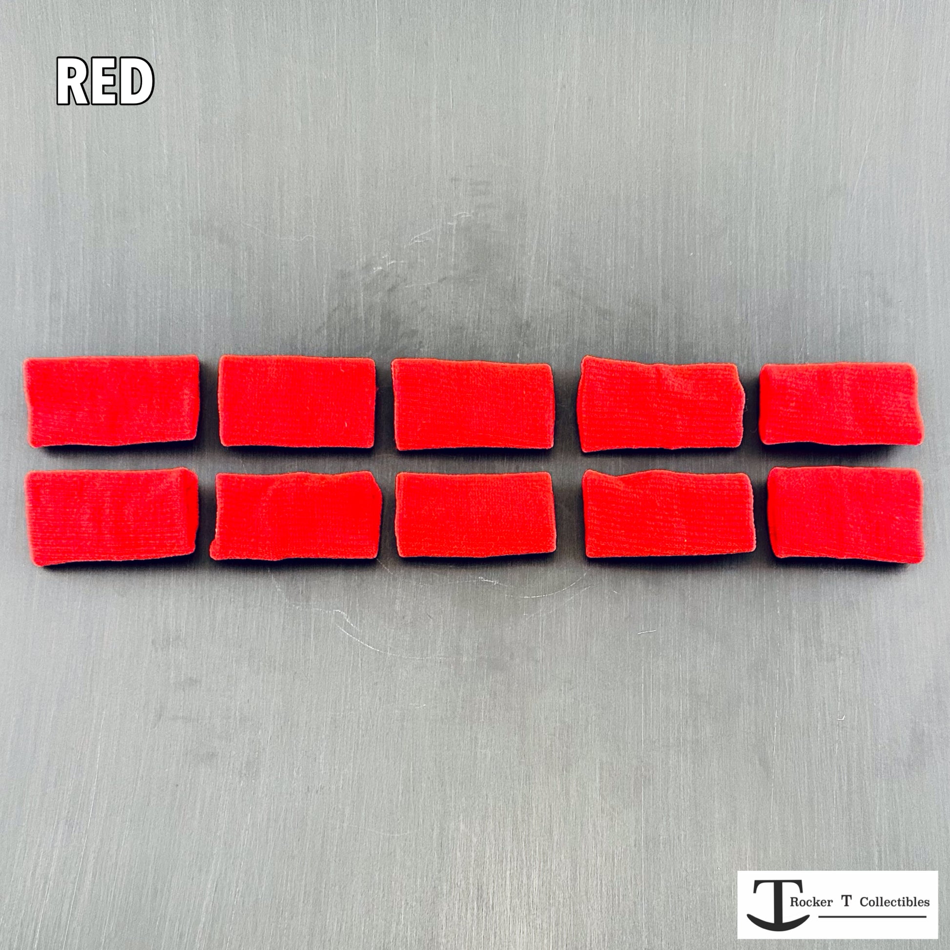 Rocker T Red "Bulk Buy" Mini Helmet Chinstrap Pads are a must-have exclusive accessory for collectors with large collections. This pack includes 10 chinstrap pads, perfect for adding vibrant color or enhancing the realism of your mini helmets. Installation is quick and easy: remove one side of the chinstrap, slide it through the pad, pull it over the chin, and reattach the strap. Bold customization made effortless!