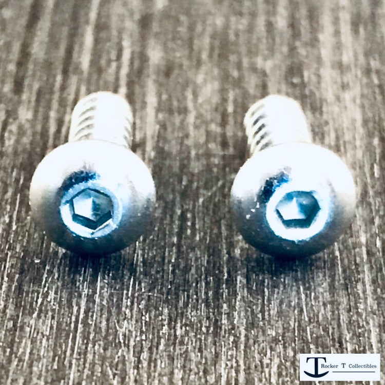 Elevate your custom mini helmet with the Rocker T Riddell-Style Quick Release Kit Facemask Clip Hardware Set. These precision screws feature round heads that fit perfectly inside Riddell Acrylic Facemask Clips, mimicking the authentic quick-release hardware used by players with Riddell Speed helmets. Installation is simple with a 5/64" Allen Key Wrench (included or sold separately). Just remove your old screws from the side-mounted facemask clips and swap in these specially designed screws. Built with extra-wide threads for secure grip in plastic, they prevent stripping and add bold realism to your collection. Don’t settle for less—detail matters.