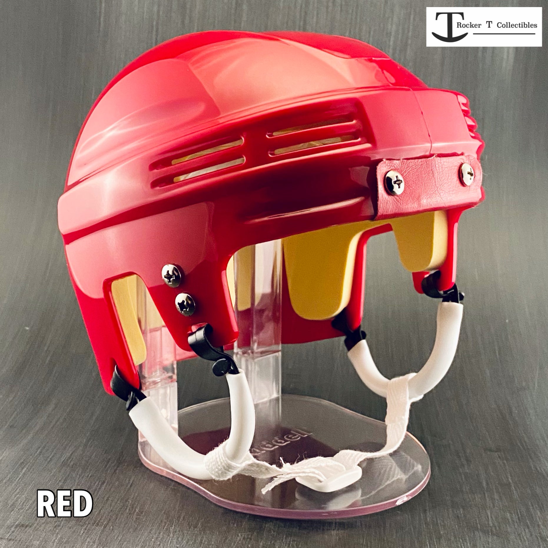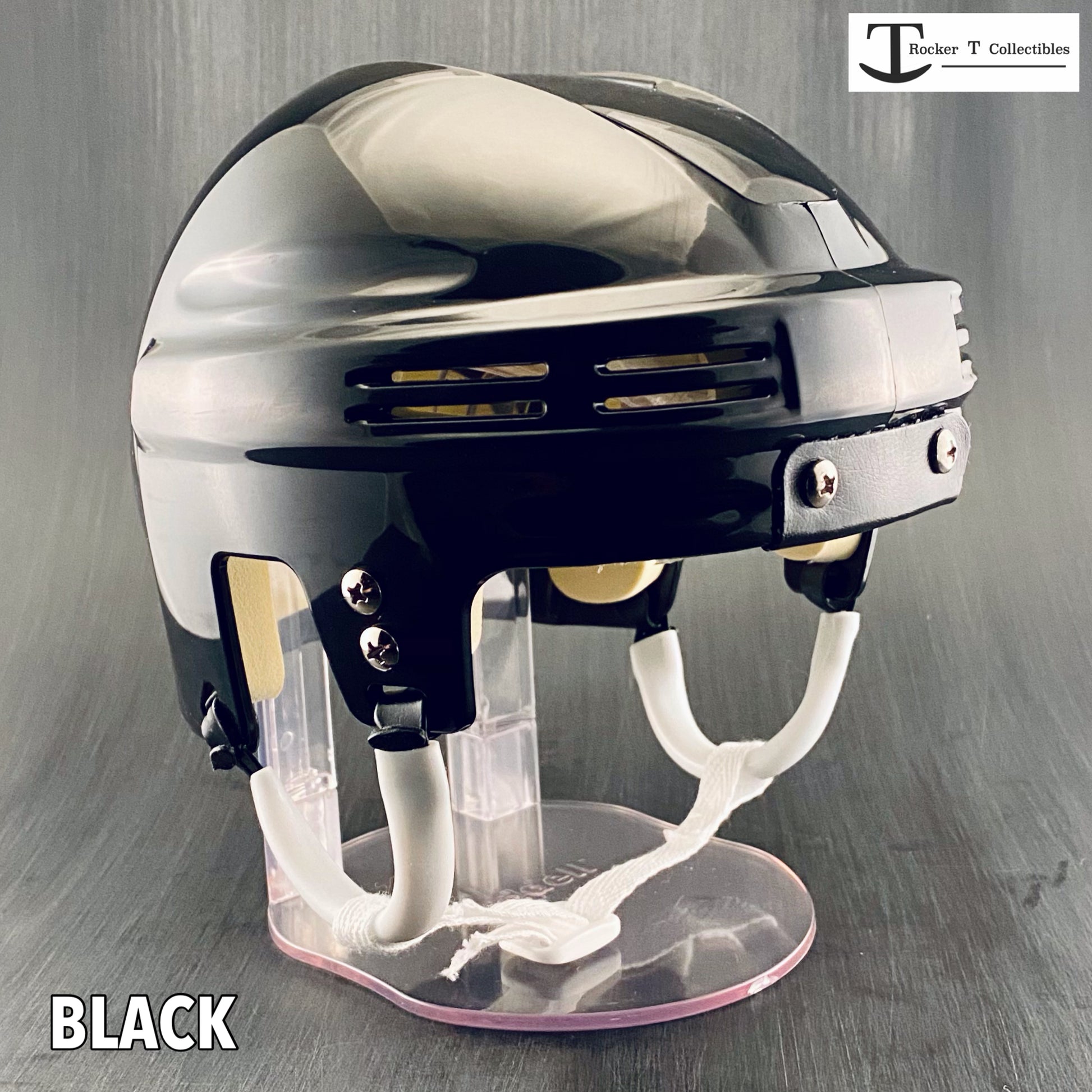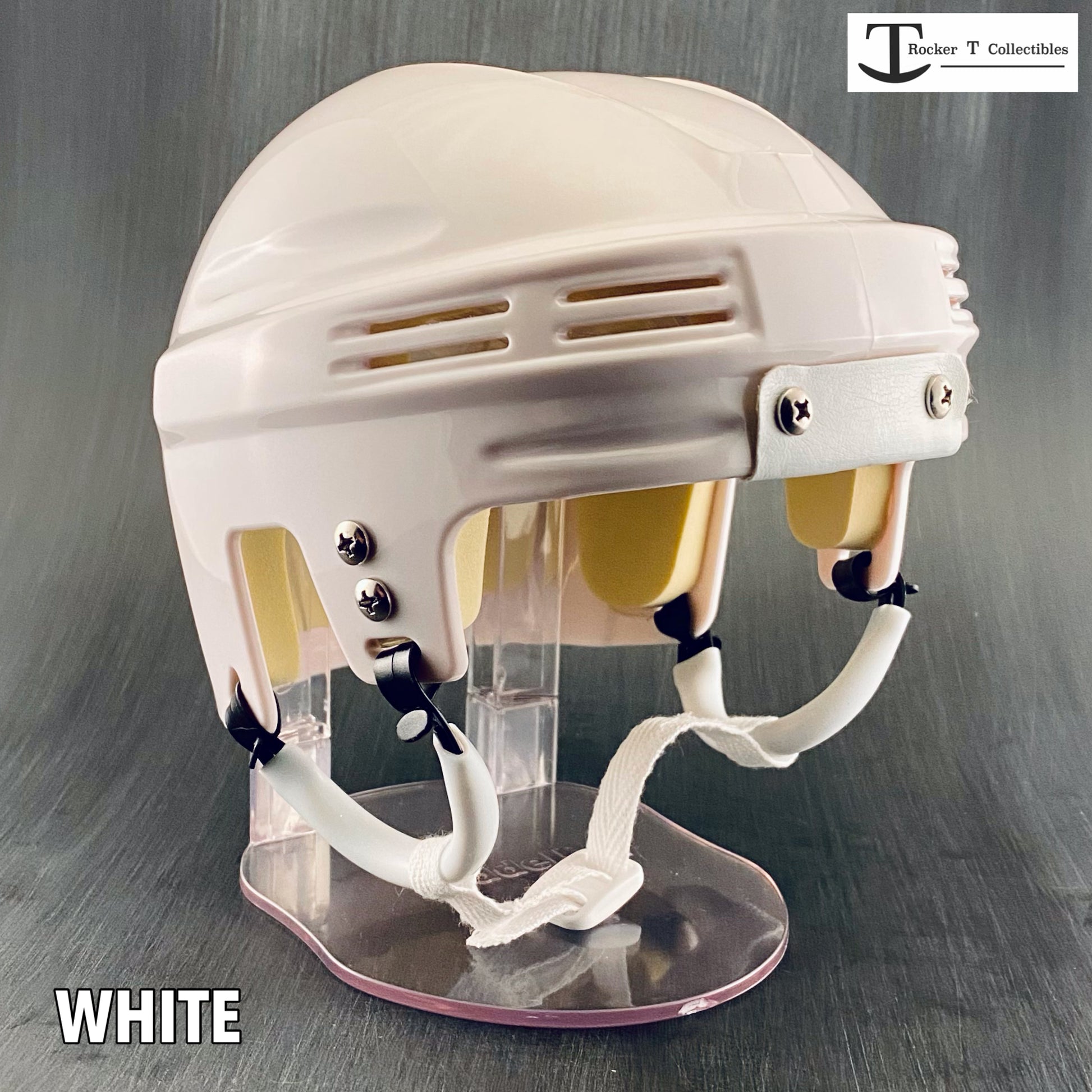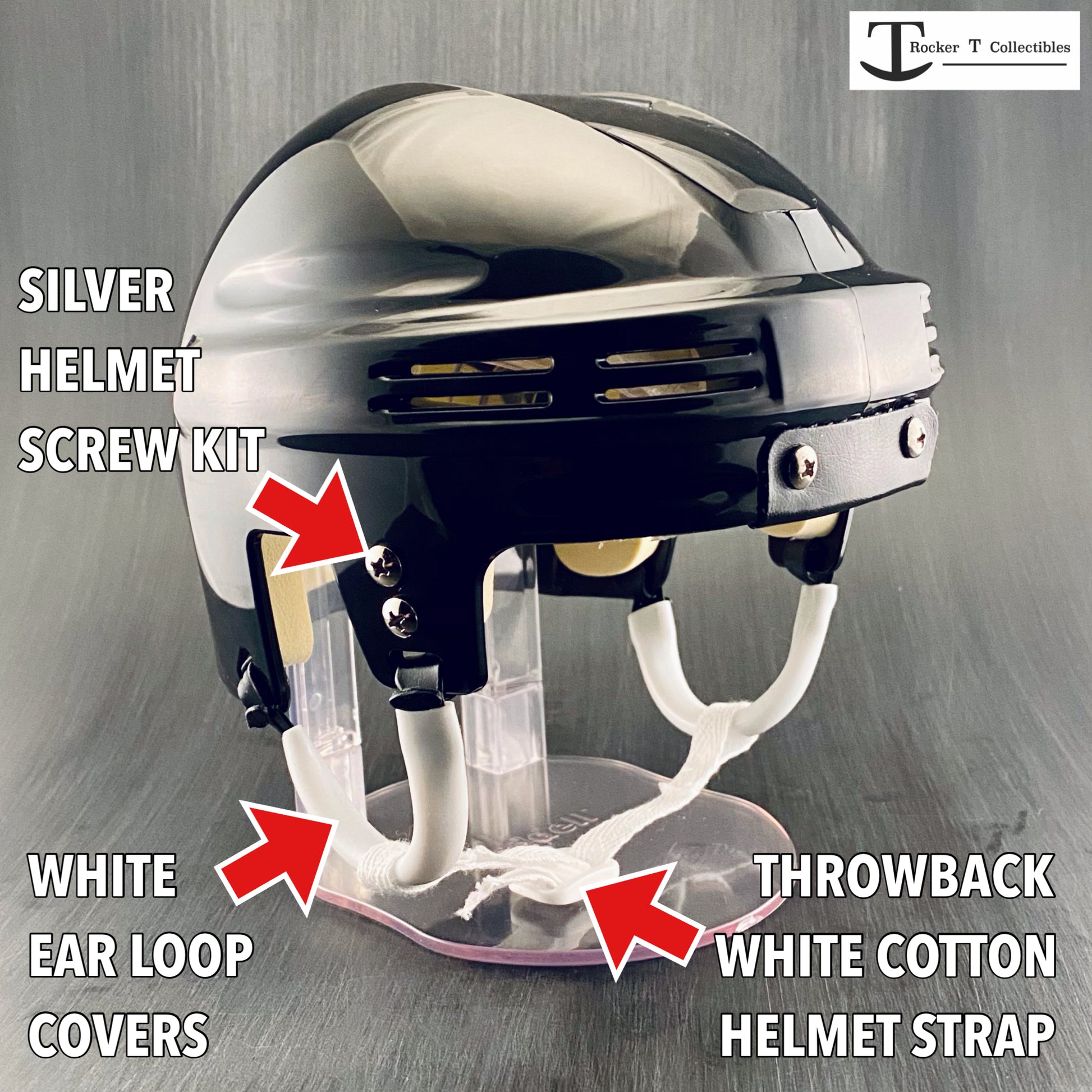 Unleash your creativity with the Rocker T Custom Throwback SportStar Hockey Mini Helmet! Perfect for crafting your own high school tribute, fundraising, autograph sessions, or vintage collections. These detailed scale models come loaded with custom white Rocker T Ear Loop Covers, a Rocker T Throwback White Cotton Helmet Strap, and a Throwback Silver Screws Kit. Grab a blank helmet to make your own bold design. Measuring about 6" x 5", each helmet arrives in a clear plastic dome for display. *Display stand sold separately.