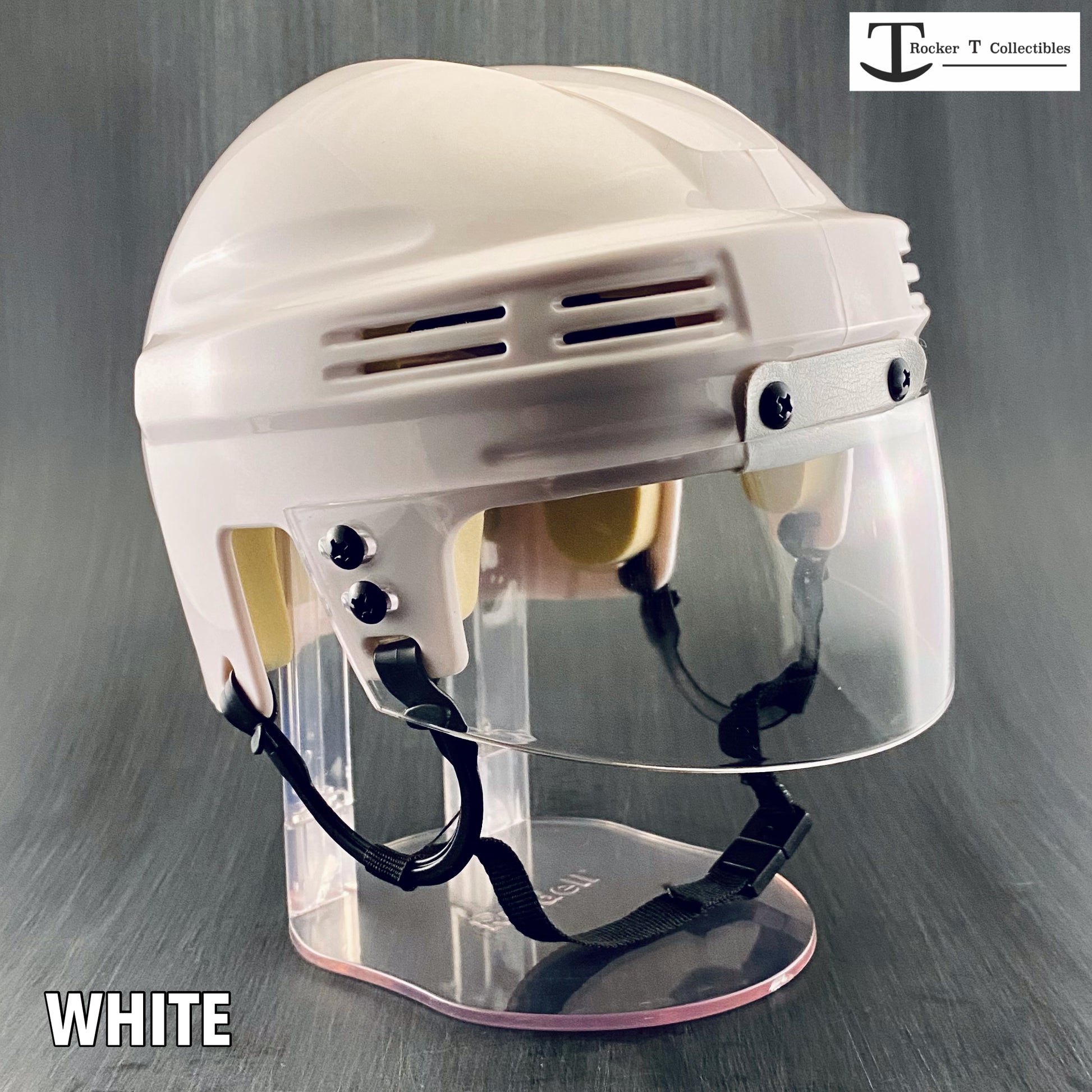 Create your own custom hockey mini helmet with Rocker T! These blank mini helmets are ideal for youth teams, fundraisers, season ticket holder giveaways, corporate gifts, and beyond. Each detailed scale model features a visor, padding, and ear loops, measuring approximately 6" x 5". They arrive in clear plastic dome packaging, ready for your unique design. *Display stand sold separately and shown only to highlight helmet details. Unleash your creativity and make a bold statement with your personalized mini helmet!
